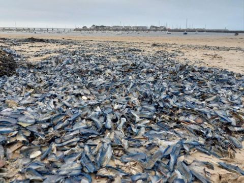 Depuis le week-end dernier, des échouages massifs de vélelles, ces organismes marins également connus sous le nom de barques de Saint-Jean ou de Saint-Pierre, ont été observés sur les plages de l'ouest de la France, notamment aux Sables-d'Olonne et près de Pornic.